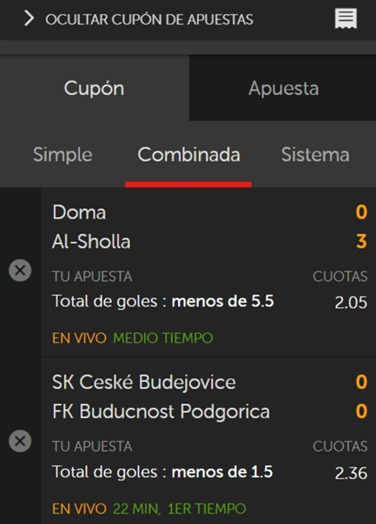 En el ejemplo de la imagen, aunque el mercado es el mismo (total de goles), el evento cambia: en uno se enfrenta Doma vs. Al-Sholla y en otro České Budějovice vs. FK Podgorica.