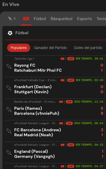 Las apuestas de fútbol ocupan un lugar central dentro del streaming en vivo. La plataforma suele ofrecer encuentros de ligas internacionales y campeonatos locales, especialmente de torneos europeos, competiciones regionales y eventos donde el seguimiento minuto a minuto marca la diferencia a la hora de pronosticar.
